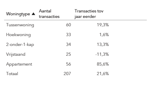 - Transacties: 34 woningen verkocht; +100% t.o.v. vorig jaar.