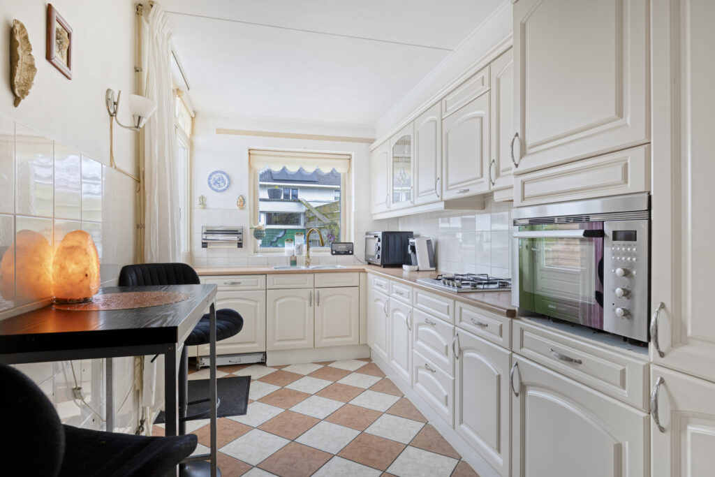 Entree met tochtportaal, hal, toilet en trapkast. De royale en lichte woonkamer (ca. 30 m²) is voorzien van een laminaatvloer en biedt een prettig uitzicht over het plantsoen. De dichte keuken (ca. 10 m²) beschikt over een hoekopstelling (2005) met diverse inbouwapparatuur, waaronder een koel-/vriescombinatie, vaatwasser, combimagnetron, gaskookplaat en afzuigkap.