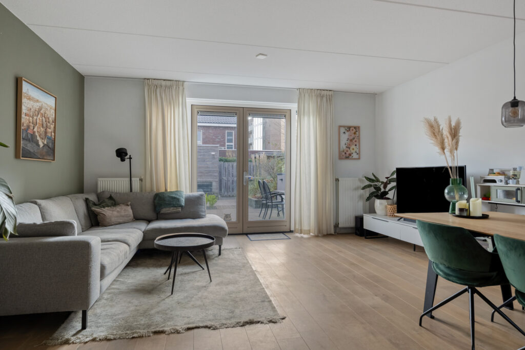 Via de entree kom je binnen in de hal met toilet, meterkast en trapopgang. De lichte, tuingerichte woonkamer voelt warm en sfeervol door de fraaie Franse eiken vloer en openslaande deuren naar de achtertuin. De keuken aan de voorzijde (ca. 9 m²) is modern uitgevoerd en voorzien van een robuust, duurzaam werkblad en diverse inbouwapparatuur, waaronder een SMEG inductiekookplaat (2025) , koelkast, vriezer, vaatwasser (2025) en afzuigkap.