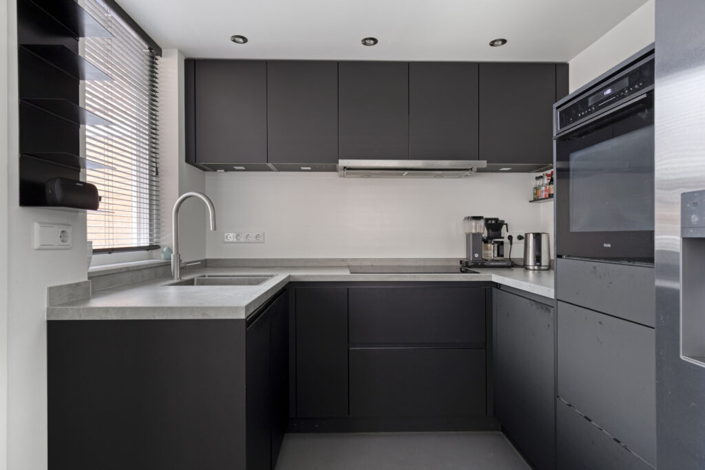 De openkeuken is strak en eigentijds uitgevoerd in donkere tinten en voorzien van moderne inbouwapparatuur, waaronder een inductiekookplaat, afzuigkap, oven compact vaatwasser en ruime werkbladen. Aansluitend bevindt zich de bijkeuken met wasmachineaansluiting en extra bergruimte.