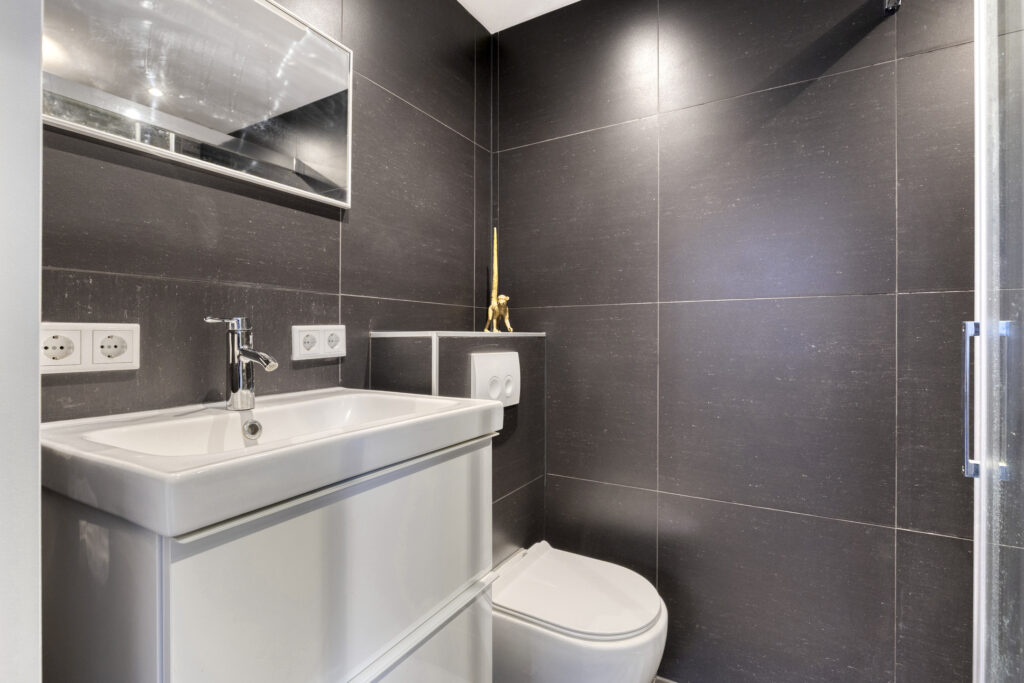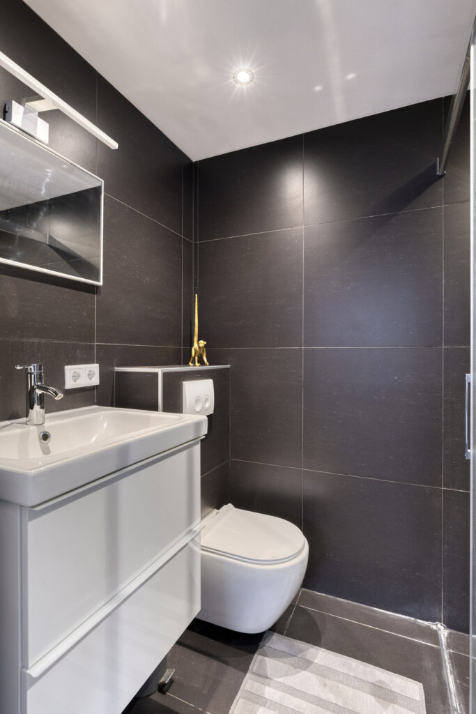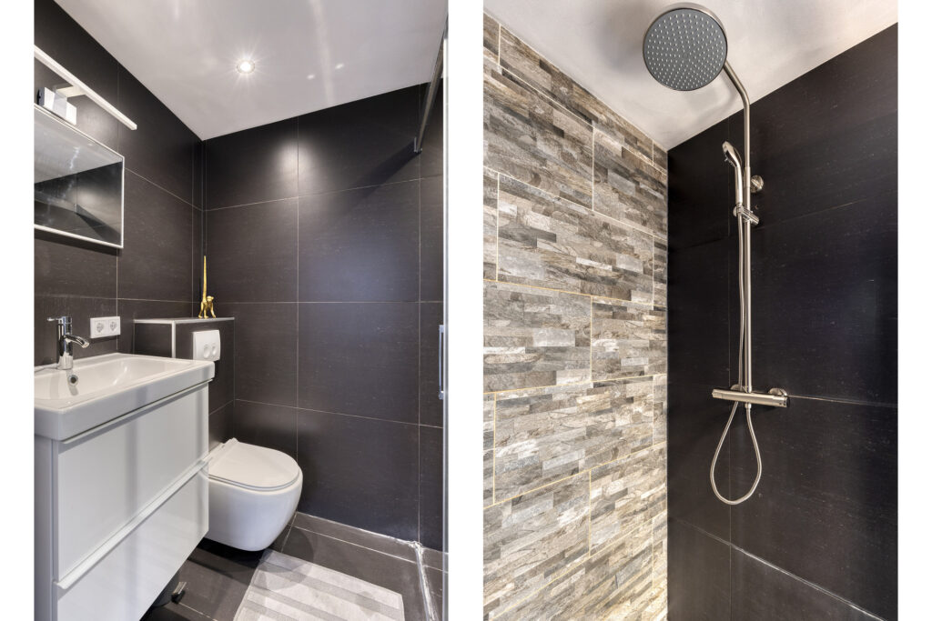 De badkamer is modern uitgevoerd en voorzien van een inloopdouche, wastafelmeubel en toilet.